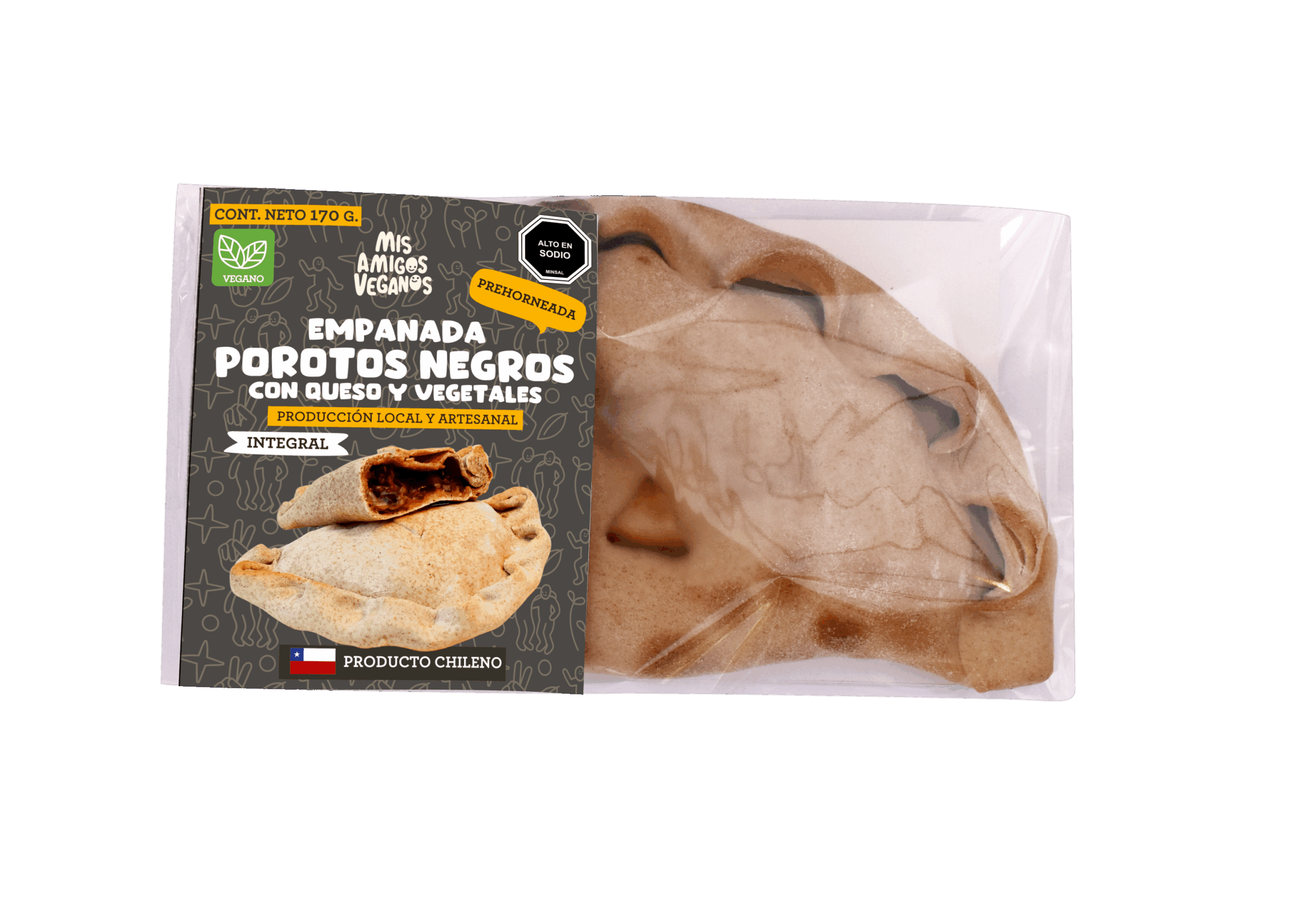 Empanada vegana prehorneada y congelada rellena de porotos negros, queso mozzarella vegano y vegetales.