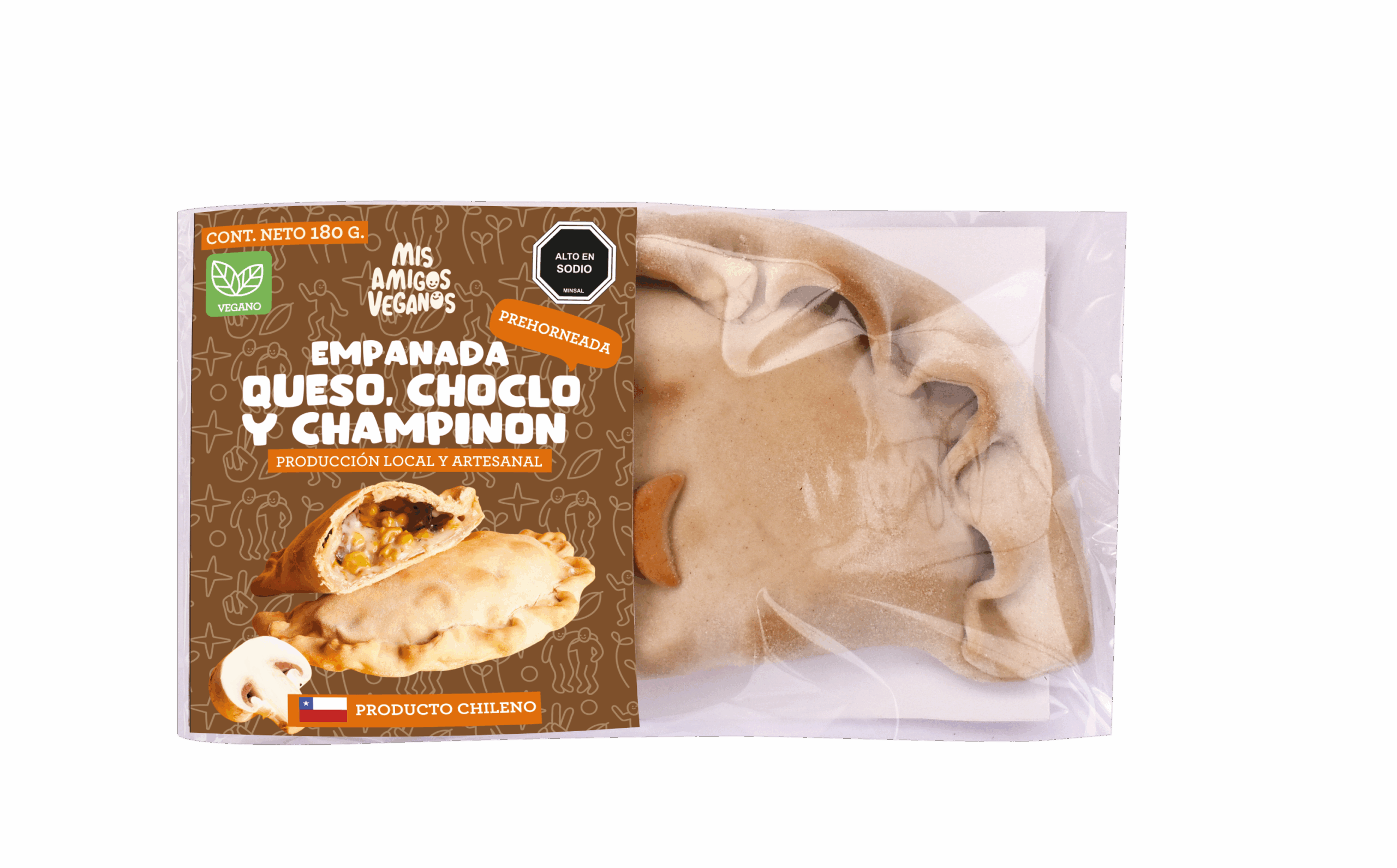 Empanada vegana prehorneada y congelada rellena con choclo, champiñón fresco y queso mozzarella vegano