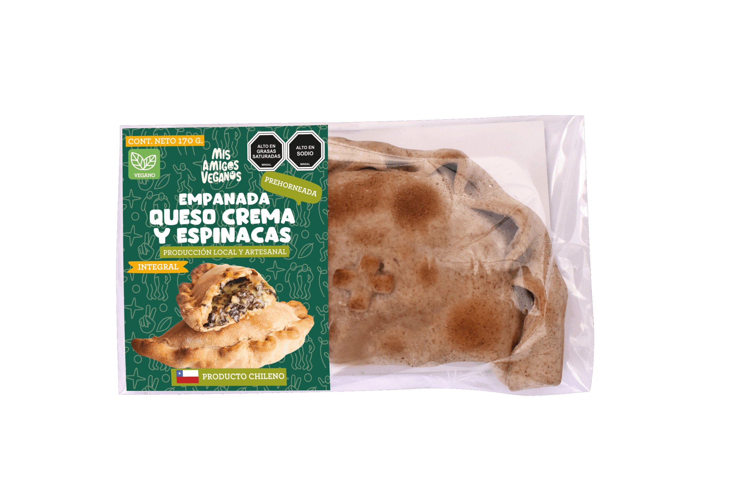 Empanada vegana prehorneada y congelada de masa integral rellena con queso crema vegetal y espinacas.
