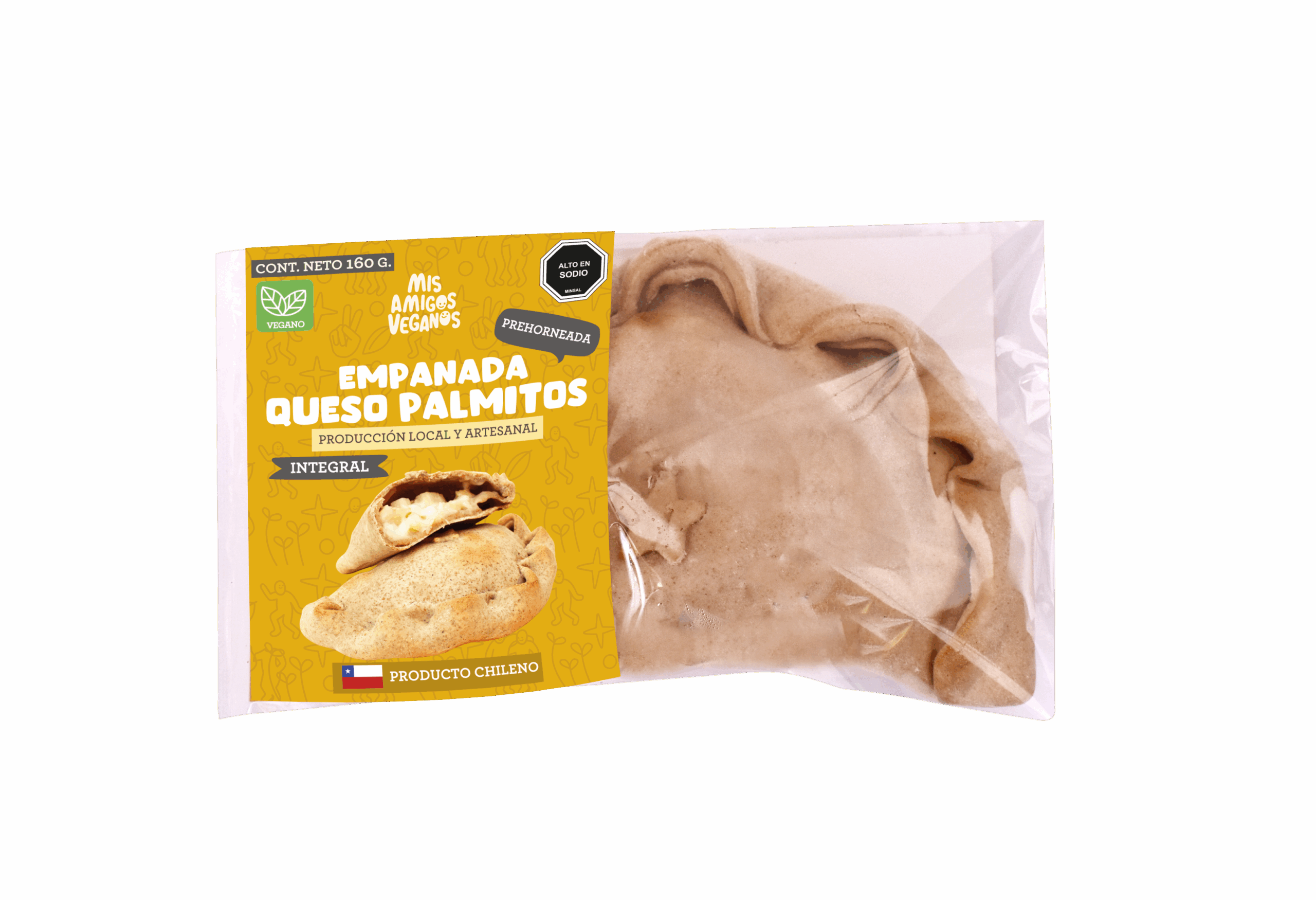 Empanada vegana prehorneada y congelada rellena con queso mozzarella, palmitos y aceitunas negras.